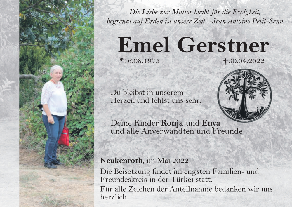Hier finden Sie alle Traueranzeigen aus der Zeitung, die bisher für Emel Gerstner erschienen sind. Weitere Traueranzeigen, die in der Zeitung erscheinen, werden hier ebenfalls aufgelistet