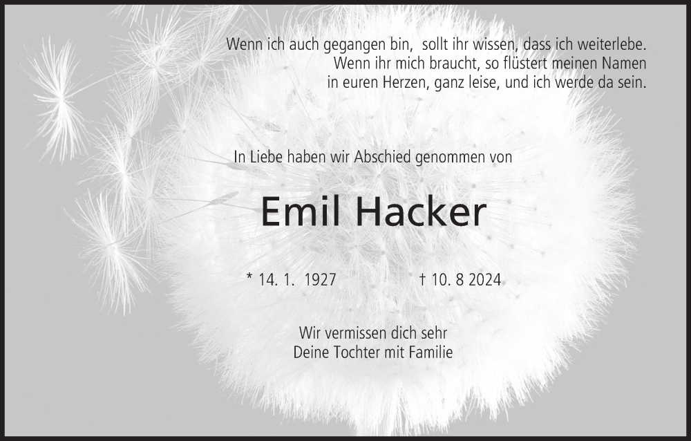 Hier finden Sie alle Traueranzeigen aus der Zeitung, die bisher für Emil Hacker erschienen sind. Weitere Traueranzeigen, die in der Zeitung erscheinen, werden hier ebenfalls aufgelistet