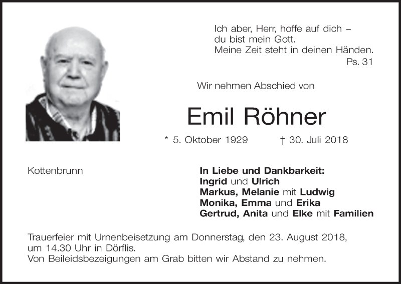 Hier finden Sie alle Traueranzeigen aus der Zeitung, die bisher für Emil Röhner erschienen sind. Weitere Traueranzeigen, die in der Zeitung erscheinen, werden hier ebenfalls aufgelistet