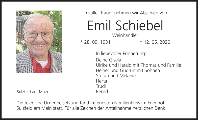 Hier finden Sie alle Traueranzeigen aus der Zeitung, die bisher für Emil Schiebel erschienen sind. Weitere Traueranzeigen, die in der Zeitung erscheinen, werden hier ebenfalls aufgelistet