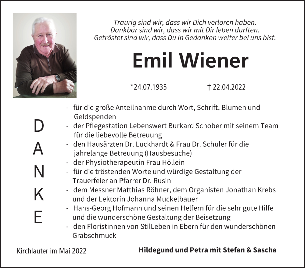 Hier finden Sie alle Traueranzeigen aus der Zeitung, die bisher für Emil Wiener erschienen sind. Weitere Traueranzeigen, die in der Zeitung erscheinen, werden hier ebenfalls aufgelistet