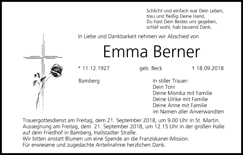 Hier finden Sie alle Traueranzeigen aus der Zeitung, die bisher für Emma Berner erschienen sind. Weitere Traueranzeigen, die in der Zeitung erscheinen, werden hier ebenfalls aufgelistet