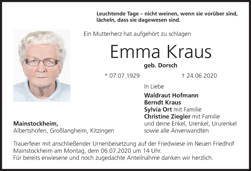 Hier finden Sie alle Traueranzeigen aus der Zeitung, die bisher für Emma Kraus erschienen sind. Weitere Traueranzeigen, die in der Zeitung erscheinen, werden hier ebenfalls aufgelistet