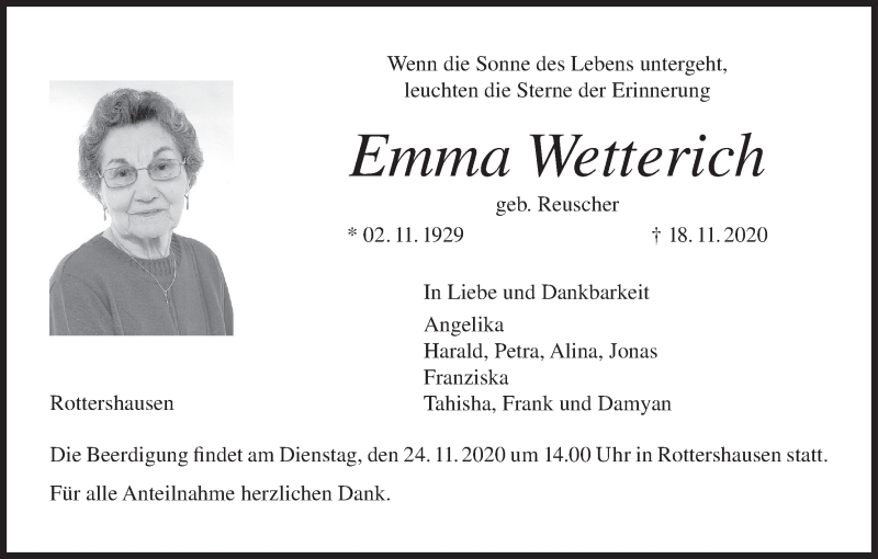 Hier finden Sie alle Traueranzeigen aus der Zeitung, die bisher für Emma Wetterich erschienen sind. Weitere Traueranzeigen, die in der Zeitung erscheinen, werden hier ebenfalls aufgelistet