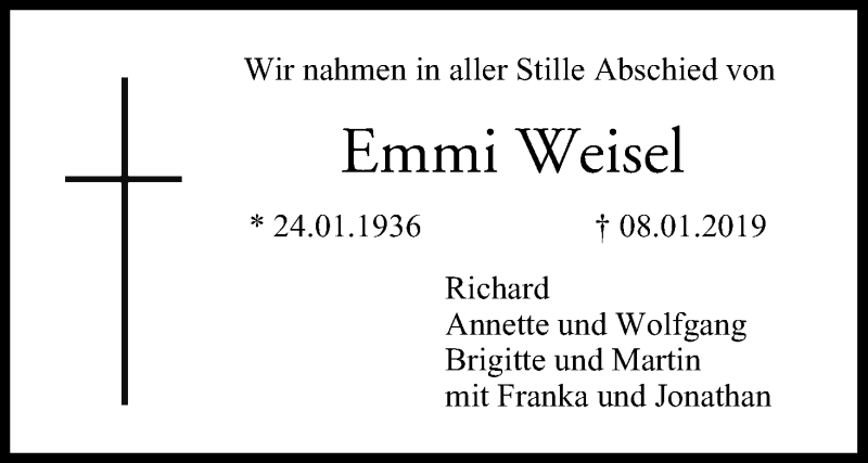 Hier finden Sie alle Traueranzeigen aus der Zeitung, die bisher für Emmi Weisel erschienen sind. Weitere Traueranzeigen, die in der Zeitung erscheinen, werden hier ebenfalls aufgelistet