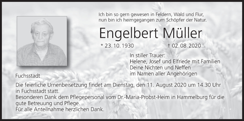 Hier finden Sie alle Traueranzeigen aus der Zeitung, die bisher für Engelbert Müller erschienen sind. Weitere Traueranzeigen, die in der Zeitung erscheinen, werden hier ebenfalls aufgelistet