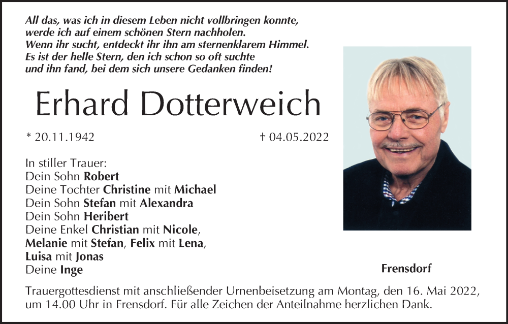 Hier finden Sie alle Traueranzeigen aus der Zeitung, die bisher für Erhard Dotterweich erschienen sind. Weitere Traueranzeigen, die in der Zeitung erscheinen, werden hier ebenfalls aufgelistet