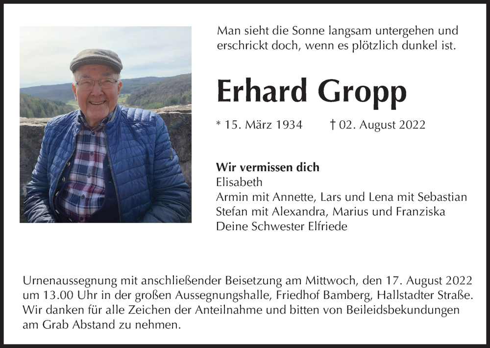 Hier finden Sie alle Traueranzeigen aus der Zeitung, die bisher für Erhard Gropp erschienen sind. Weitere Traueranzeigen, die in der Zeitung erscheinen, werden hier ebenfalls aufgelistet