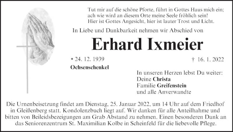 Hier finden Sie alle Traueranzeigen aus der Zeitung, die bisher für Erhard Ixmeier erschienen sind. Weitere Traueranzeigen, die in der Zeitung erscheinen, werden hier ebenfalls aufgelistet