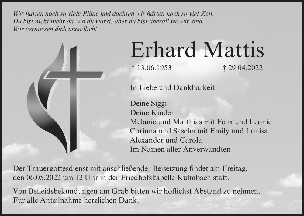 Hier finden Sie alle Traueranzeigen aus der Zeitung, die bisher für Erhard Mattis erschienen sind. Weitere Traueranzeigen, die in der Zeitung erscheinen, werden hier ebenfalls aufgelistet