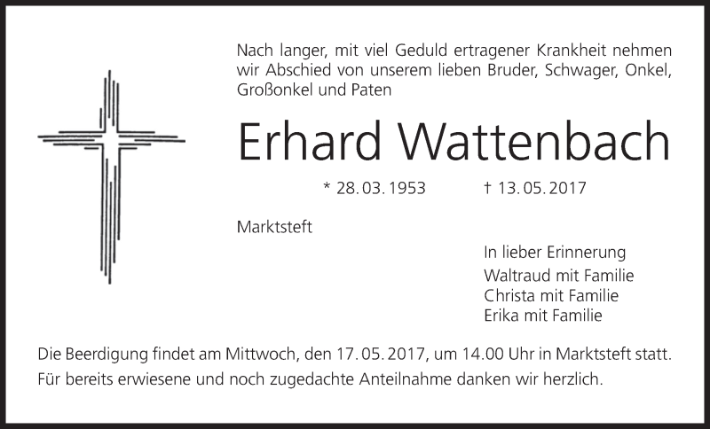 Hier finden Sie alle Traueranzeigen aus der Zeitung, die bisher für Erhard Wattenbach erschienen sind. Weitere Traueranzeigen, die in der Zeitung erscheinen, werden hier ebenfalls aufgelistet