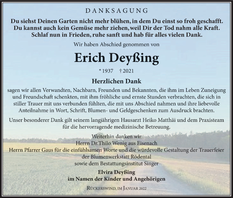 Hier finden Sie alle Traueranzeigen aus der Zeitung, die bisher für Erich Deyßing erschienen sind. Weitere Traueranzeigen, die in der Zeitung erscheinen, werden hier ebenfalls aufgelistet