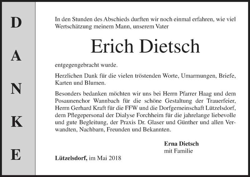Hier finden Sie alle Traueranzeigen aus der Zeitung, die bisher für Erich Dietsch erschienen sind. Weitere Traueranzeigen, die in der Zeitung erscheinen, werden hier ebenfalls aufgelistet