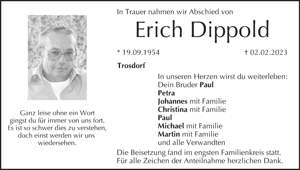 Hier finden Sie alle Traueranzeigen aus der Zeitung, die bisher für Erich Dippold erschienen sind. Weitere Traueranzeigen, die in der Zeitung erscheinen, werden hier ebenfalls aufgelistet