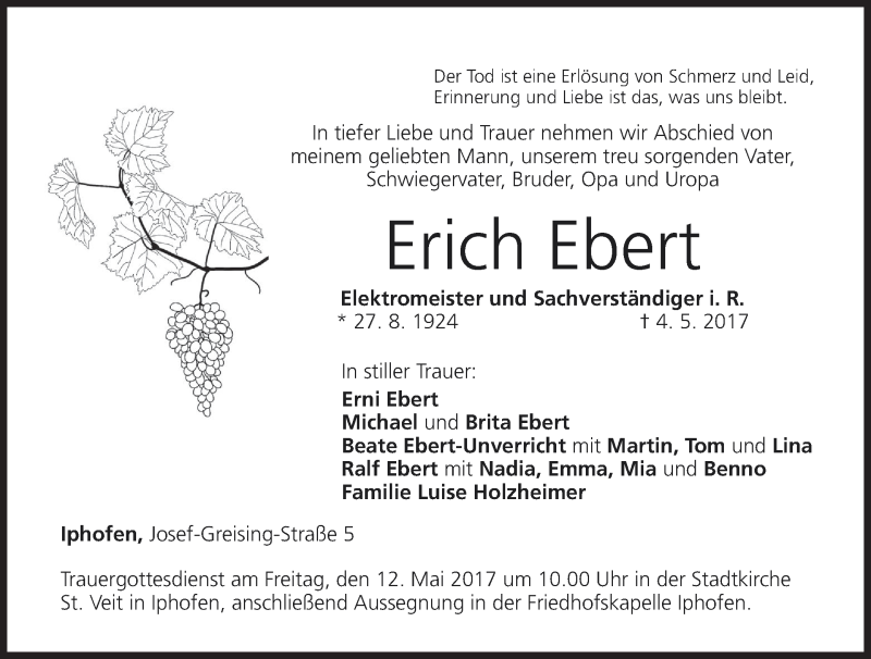 Hier finden Sie alle Traueranzeigen aus der Zeitung, die bisher für Erich Ebert erschienen sind. Weitere Traueranzeigen, die in der Zeitung erscheinen, werden hier ebenfalls aufgelistet
