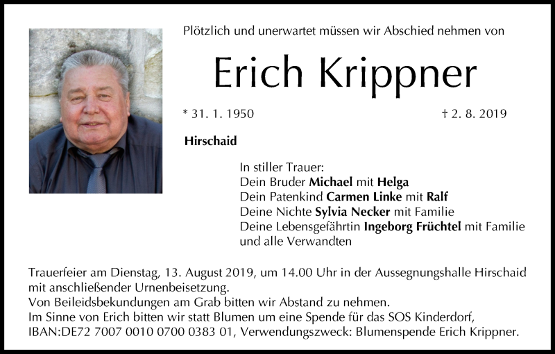 Hier finden Sie alle Traueranzeigen aus der Zeitung, die bisher für Erich Krippner erschienen sind. Weitere Traueranzeigen, die in der Zeitung erscheinen, werden hier ebenfalls aufgelistet