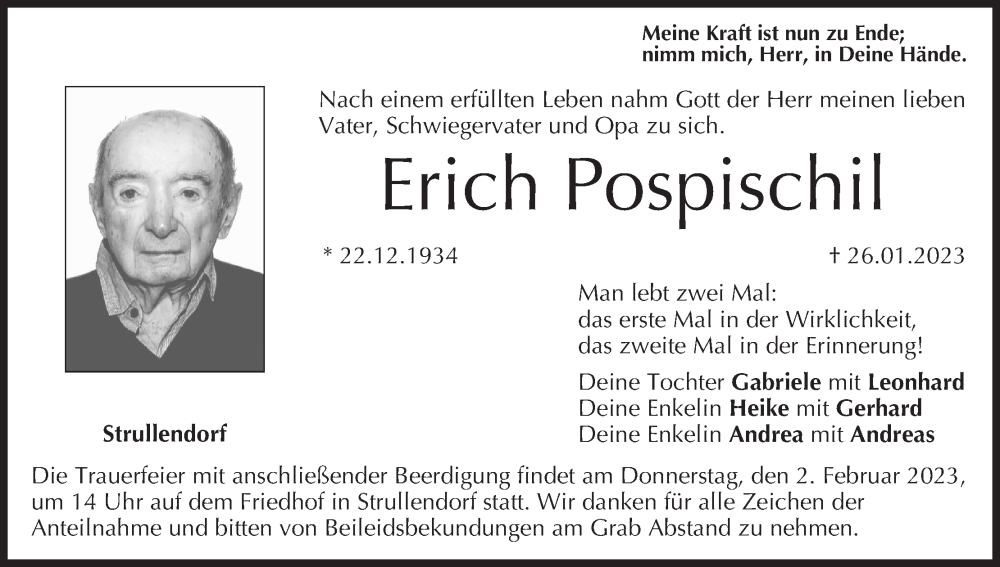 Hier finden Sie alle Traueranzeigen aus der Zeitung, die bisher für Erich Pospischil erschienen sind. Weitere Traueranzeigen, die in der Zeitung erscheinen, werden hier ebenfalls aufgelistet