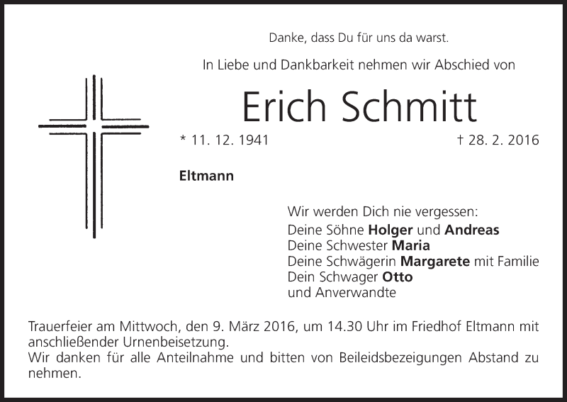 Hier finden Sie alle Traueranzeigen aus der Zeitung, die bisher für Erich Schmitt erschienen sind. Weitere Traueranzeigen, die in der Zeitung erscheinen, werden hier ebenfalls aufgelistet