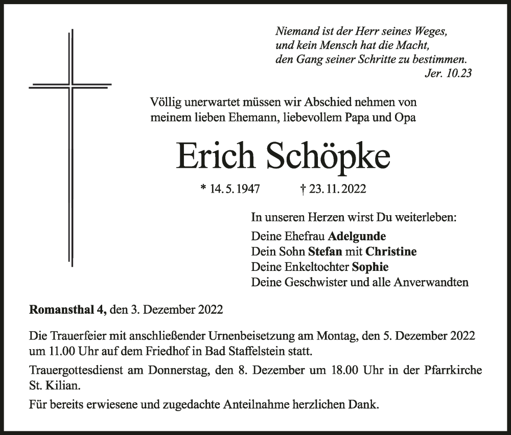 Hier finden Sie alle Traueranzeigen aus der Zeitung, die bisher für Erich Schöpke erschienen sind. Weitere Traueranzeigen, die in der Zeitung erscheinen, werden hier ebenfalls aufgelistet