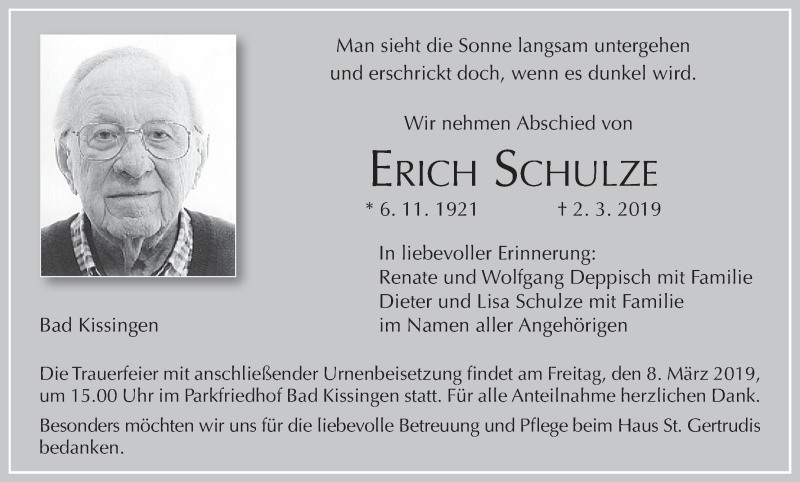 Hier finden Sie alle Traueranzeigen aus der Zeitung, die bisher für Erich Schulze erschienen sind. Weitere Traueranzeigen, die in der Zeitung erscheinen, werden hier ebenfalls aufgelistet
