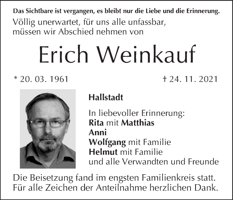 Hier finden Sie alle Traueranzeigen aus der Zeitung, die bisher für Erich Weinkauf erschienen sind. Weitere Traueranzeigen, die in der Zeitung erscheinen, werden hier ebenfalls aufgelistet