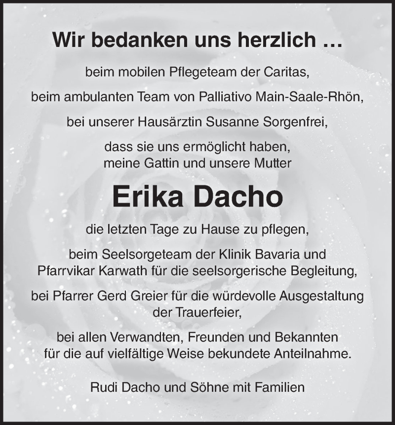 Hier finden Sie alle Traueranzeigen aus der Zeitung, die bisher für Erika Dacho erschienen sind. Weitere Traueranzeigen, die in der Zeitung erscheinen, werden hier ebenfalls aufgelistet