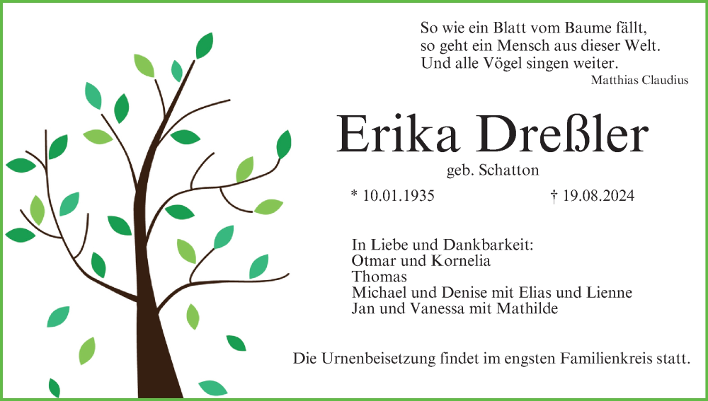 Hier finden Sie alle Traueranzeigen aus der Zeitung, die bisher für Erika Dreßler erschienen sind. Weitere Traueranzeigen, die in der Zeitung erscheinen, werden hier ebenfalls aufgelistet