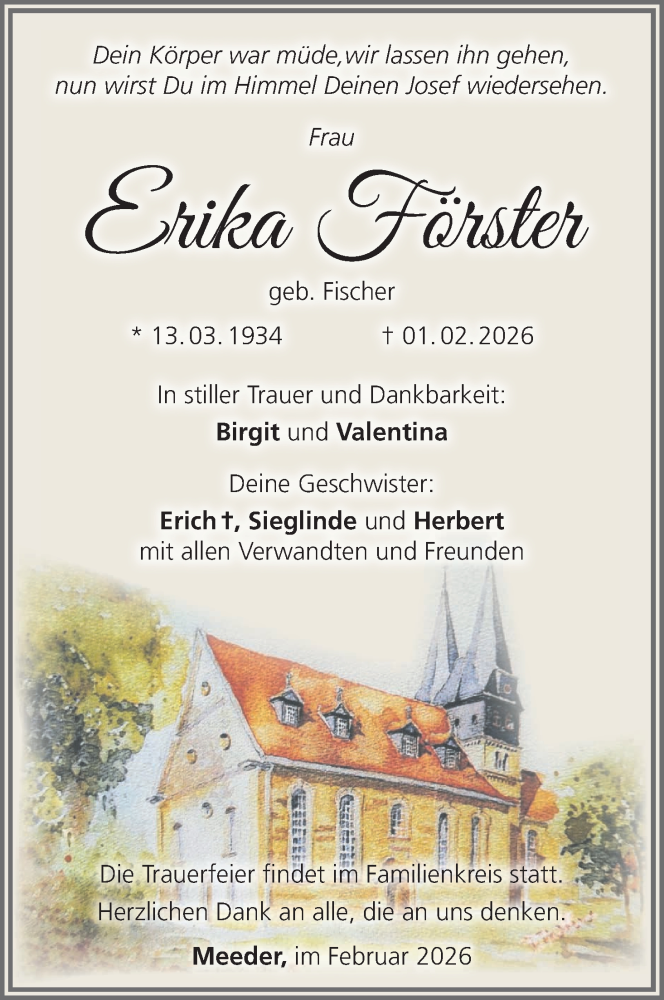 Hier finden Sie alle Traueranzeigen aus der Zeitung, die bisher für Erika Förster erschienen sind. Weitere Traueranzeigen, die in der Zeitung erscheinen, werden hier ebenfalls aufgelistet