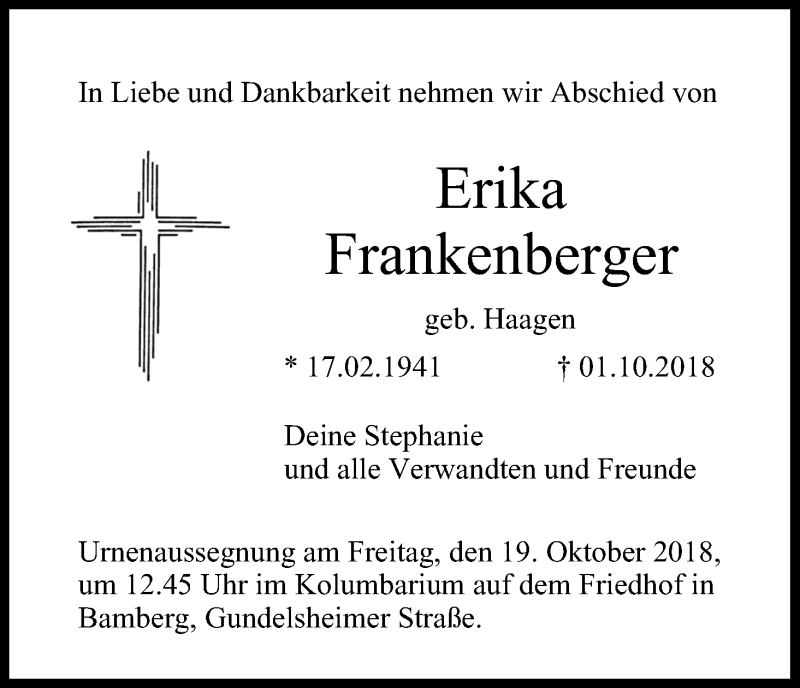 Hier finden Sie alle Traueranzeigen aus der Zeitung, die bisher für Erika Frankenberger erschienen sind. Weitere Traueranzeigen, die in der Zeitung erscheinen, werden hier ebenfalls aufgelistet