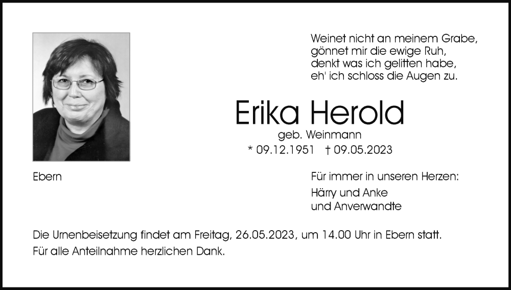 Hier finden Sie alle Traueranzeigen aus der Zeitung, die bisher für Erika Herold erschienen sind. Weitere Traueranzeigen, die in der Zeitung erscheinen, werden hier ebenfalls aufgelistet