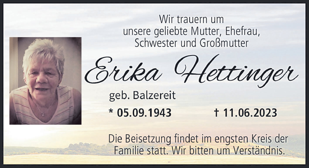 Hier finden Sie alle Traueranzeigen aus der Zeitung, die bisher für Erika Hettinger erschienen sind. Weitere Traueranzeigen, die in der Zeitung erscheinen, werden hier ebenfalls aufgelistet