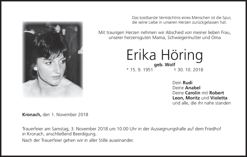 Hier finden Sie alle Traueranzeigen aus der Zeitung, die bisher für Erika Höring erschienen sind. Weitere Traueranzeigen, die in der Zeitung erscheinen, werden hier ebenfalls aufgelistet