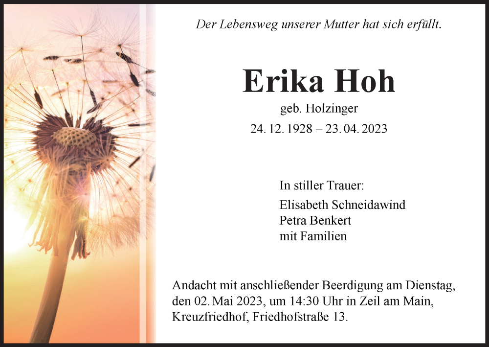 Hier finden Sie alle Traueranzeigen aus der Zeitung, die bisher für Erika Hoh erschienen sind. Weitere Traueranzeigen, die in der Zeitung erscheinen, werden hier ebenfalls aufgelistet