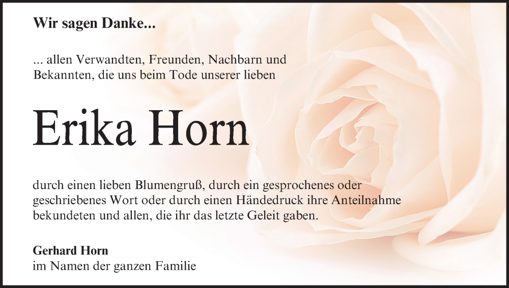 Hier finden Sie alle Traueranzeigen aus der Zeitung, die bisher für Erika Horn erschienen sind. Weitere Traueranzeigen, die in der Zeitung erscheinen, werden hier ebenfalls aufgelistet