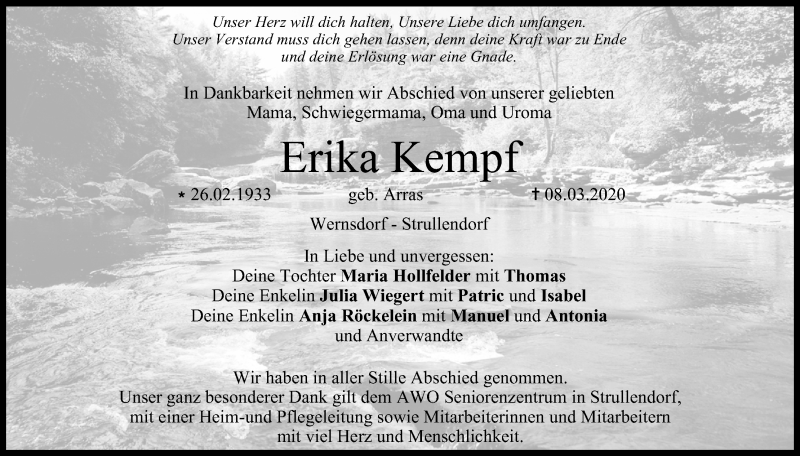 Hier finden Sie alle Traueranzeigen aus der Zeitung, die bisher für Erika Kempf erschienen sind. Weitere Traueranzeigen, die in der Zeitung erscheinen, werden hier ebenfalls aufgelistet