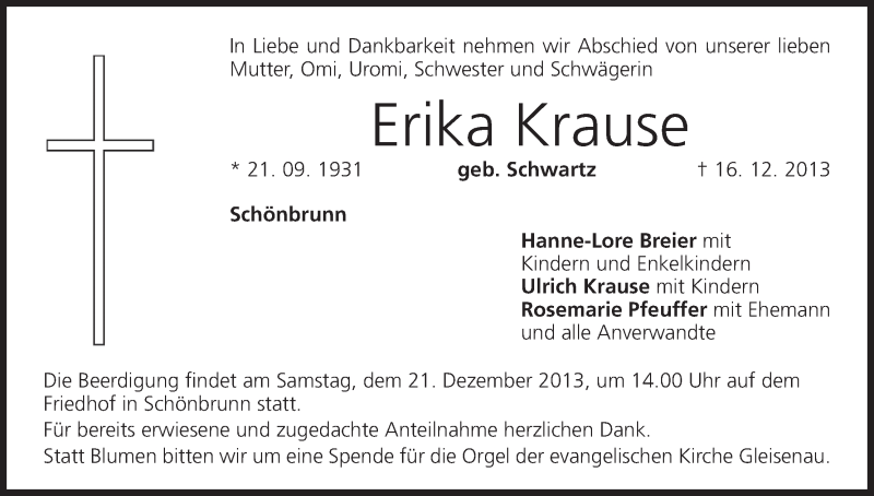 Hier finden Sie alle Traueranzeigen aus der Zeitung, die bisher für Erika Krause erschienen sind. Weitere Traueranzeigen, die in der Zeitung erscheinen, werden hier ebenfalls aufgelistet