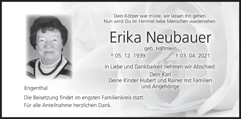 Hier finden Sie alle Traueranzeigen aus der Zeitung, die bisher für Erika Neubauer erschienen sind. Weitere Traueranzeigen, die in der Zeitung erscheinen, werden hier ebenfalls aufgelistet