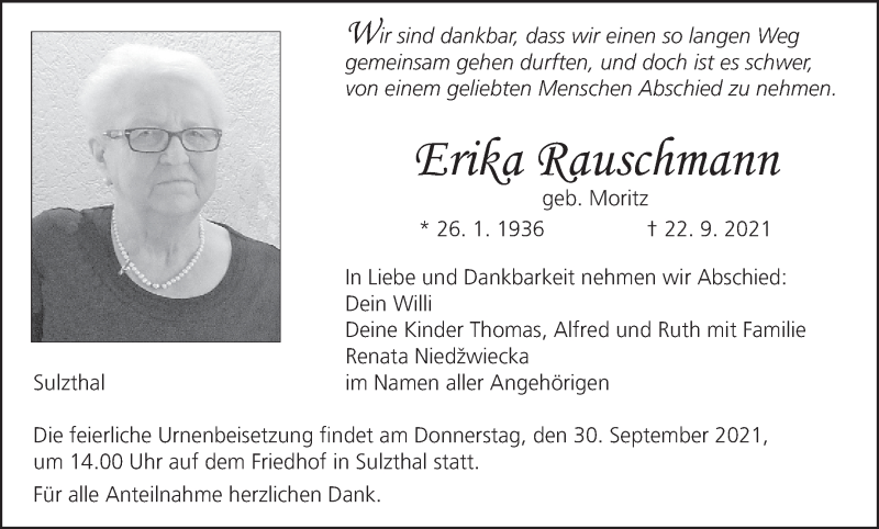 Hier finden Sie alle Traueranzeigen aus der Zeitung, die bisher für Erika Rauschmann erschienen sind. Weitere Traueranzeigen, die in der Zeitung erscheinen, werden hier ebenfalls aufgelistet