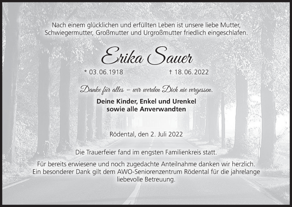 Hier finden Sie alle Traueranzeigen aus der Zeitung, die bisher für Erika Sauer erschienen sind. Weitere Traueranzeigen, die in der Zeitung erscheinen, werden hier ebenfalls aufgelistet