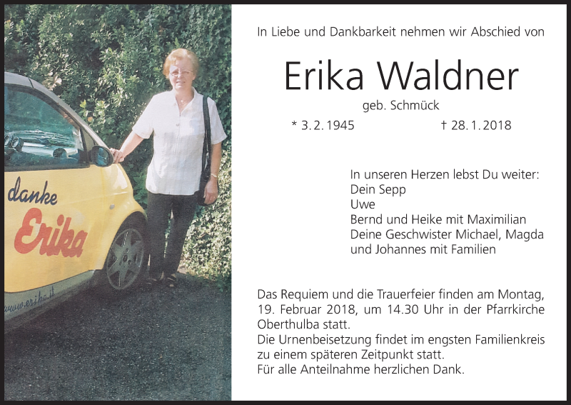 Hier finden Sie alle Traueranzeigen aus der Zeitung, die bisher für Erika Waldner erschienen sind. Weitere Traueranzeigen, die in der Zeitung erscheinen, werden hier ebenfalls aufgelistet