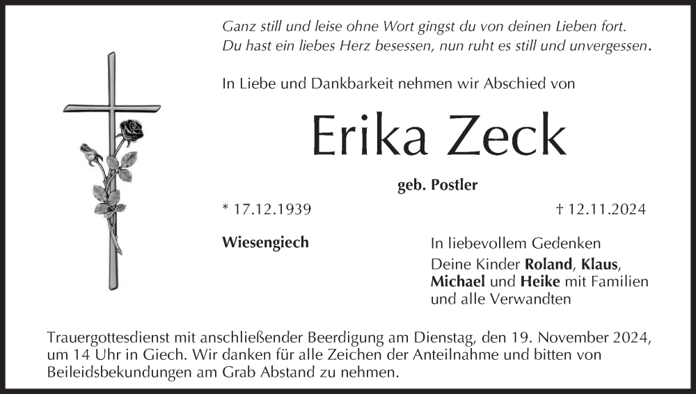 Hier finden Sie alle Traueranzeigen aus der Zeitung, die bisher für Erika Zeck erschienen sind. Weitere Traueranzeigen, die in der Zeitung erscheinen, werden hier ebenfalls aufgelistet