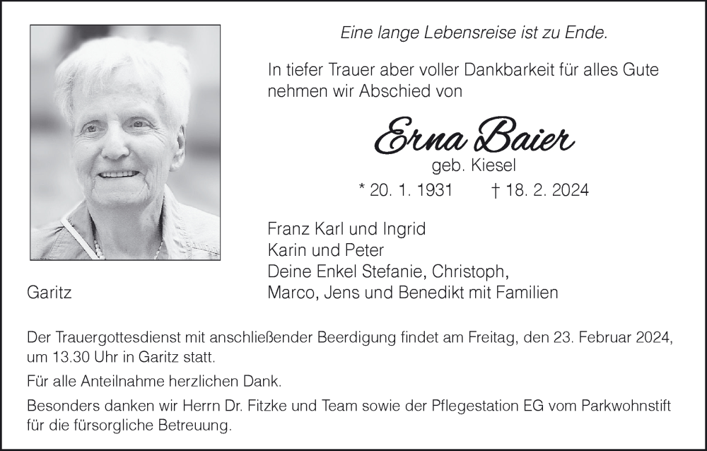 Hier finden Sie alle Traueranzeigen aus der Zeitung, die bisher für Erna Baier erschienen sind. Weitere Traueranzeigen, die in der Zeitung erscheinen, werden hier ebenfalls aufgelistet