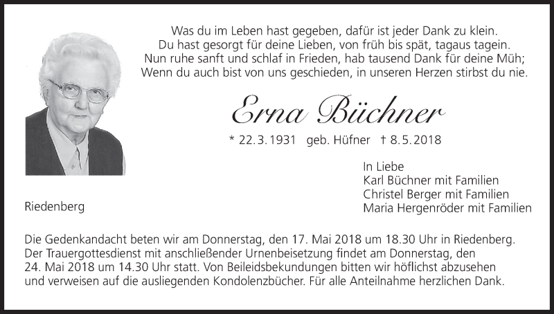 Hier finden Sie alle Traueranzeigen aus der Zeitung, die bisher für Erna Büchner erschienen sind. Weitere Traueranzeigen, die in der Zeitung erscheinen, werden hier ebenfalls aufgelistet