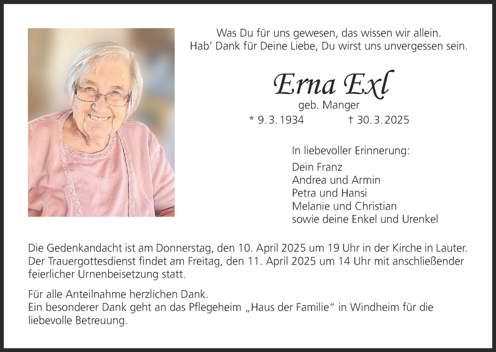 Hier finden Sie alle Traueranzeigen aus der Zeitung, die bisher für Erna Exl erschienen sind. Weitere Traueranzeigen, die in der Zeitung erscheinen, werden hier ebenfalls aufgelistet