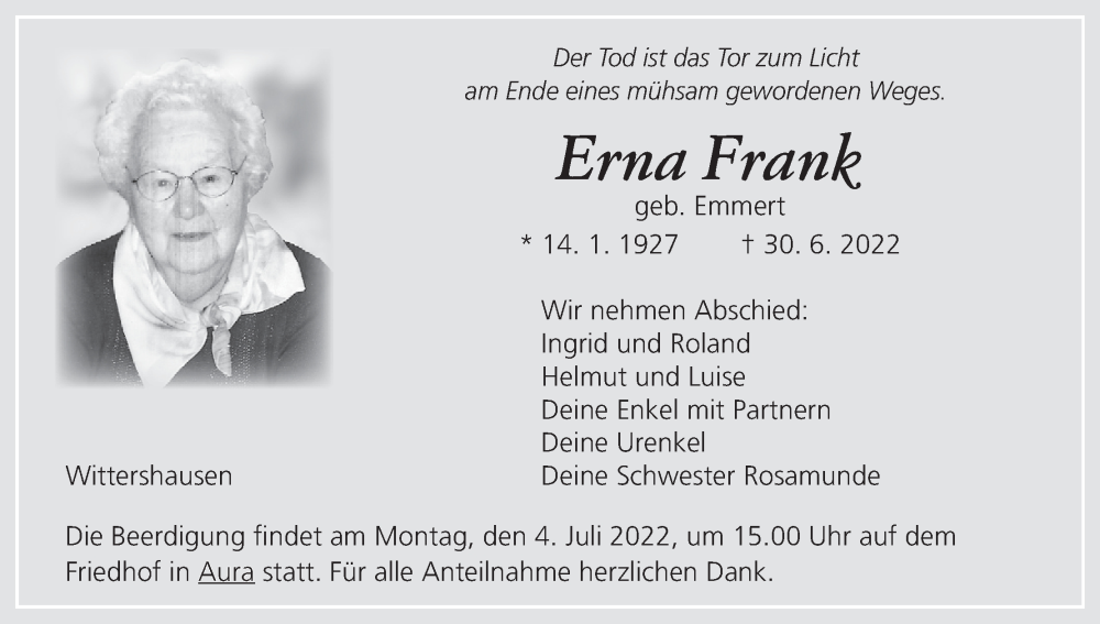 Hier finden Sie alle Traueranzeigen aus der Zeitung, die bisher für Erna Frank erschienen sind. Weitere Traueranzeigen, die in der Zeitung erscheinen, werden hier ebenfalls aufgelistet