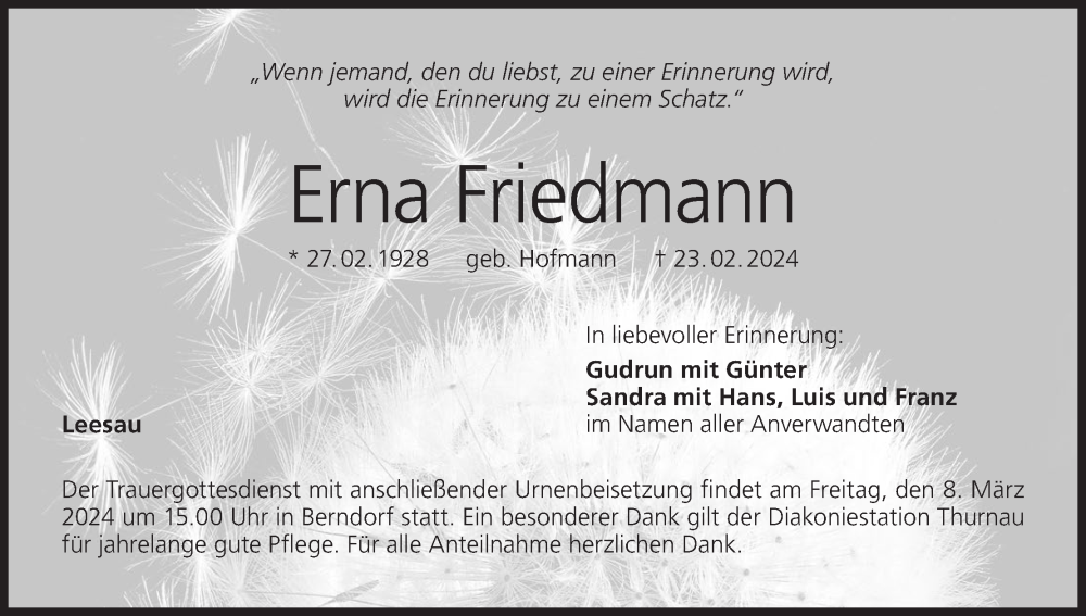 Hier finden Sie alle Traueranzeigen aus der Zeitung, die bisher für Erna Friedmann erschienen sind. Weitere Traueranzeigen, die in der Zeitung erscheinen, werden hier ebenfalls aufgelistet