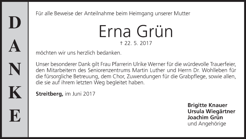 Hier finden Sie alle Traueranzeigen aus der Zeitung, die bisher für Erna Grün erschienen sind. Weitere Traueranzeigen, die in der Zeitung erscheinen, werden hier ebenfalls aufgelistet