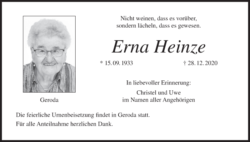 Hier finden Sie alle Traueranzeigen aus der Zeitung, die bisher für Erna Heinze erschienen sind. Weitere Traueranzeigen, die in der Zeitung erscheinen, werden hier ebenfalls aufgelistet
