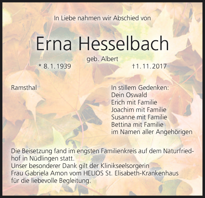 Hier finden Sie alle Traueranzeigen aus der Zeitung, die bisher für Erna Hesselbach erschienen sind. Weitere Traueranzeigen, die in der Zeitung erscheinen, werden hier ebenfalls aufgelistet