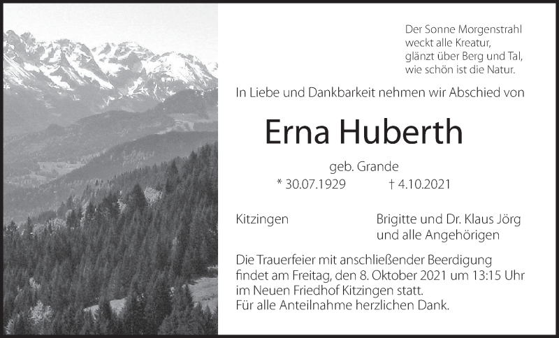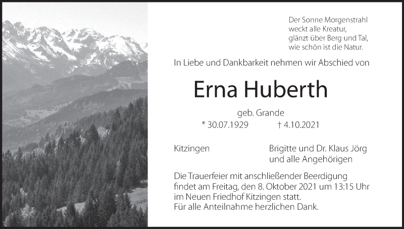 Hier finden Sie alle Traueranzeigen aus der Zeitung, die bisher für Erna Huberth erschienen sind. Weitere Traueranzeigen, die in der Zeitung erscheinen, werden hier ebenfalls aufgelistet